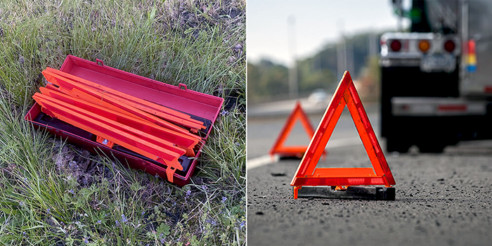 Someone left a box of orange warning triangles that trucks use when they are at the side of the road.