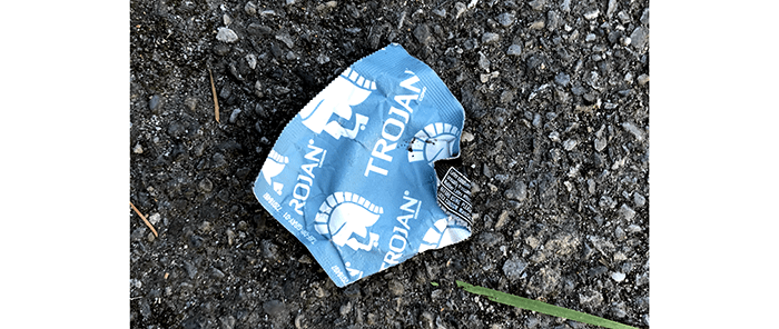 Under the freeway, someone tossed out an unopened condom.
