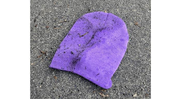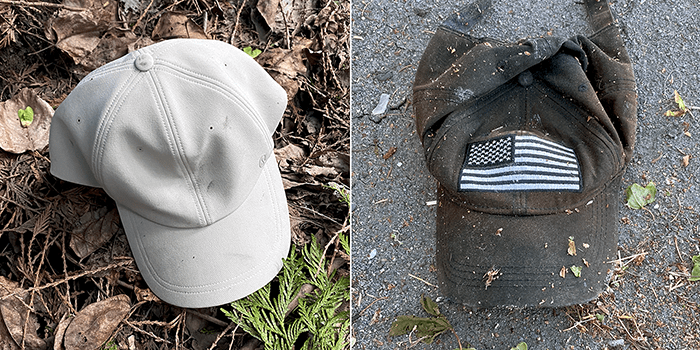 A nondescript cream-colored cap and a cap with an American flag. We will wash them both. The cream hat with no personality may go to Goodwill. The other will definitely be added to our found hat collection as the 43rd hat.