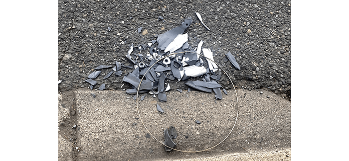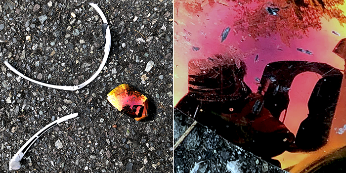 On Brickyard Road, we found a smashed pair of sunglasses in a crosswalk. We hope they were dropped and not worn when they got smashed.