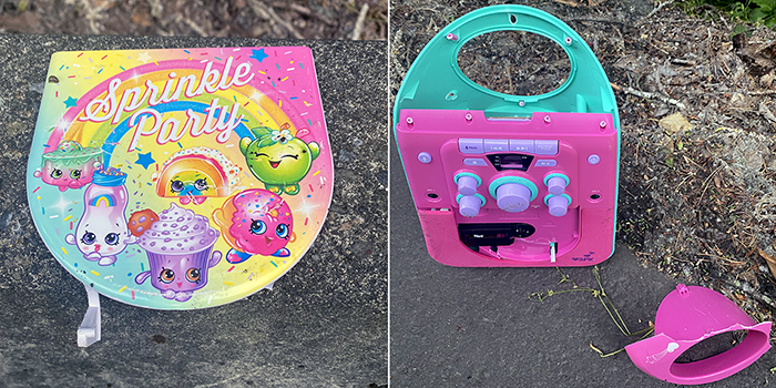Along Juanita-Woodinville Way, we picked up a piece of plastic with Sprinkle Party on it. Several feet later, down the bank, we found more pieces including the main body. It was a Shopkins Portable singing Karaoke Machine. Yeah, we would probably toss it out the window too.