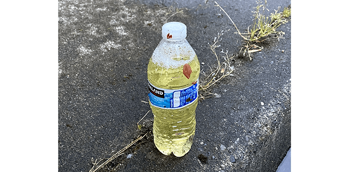 Another water bottle with yellow liquid in it. See item 7 of the top reasons we wear rubber gloves.