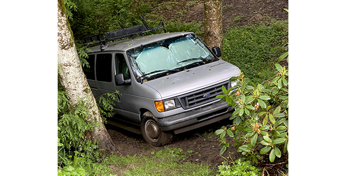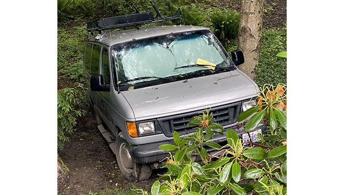 For a couple of weeks, this van and a picnic table have been sitting off to the side of the road. The story we have is that the land it is on consists of a parcel of six-hundred square feet, about twenty-five feet square. They purchased it from the county on auction and have placed a picnic table and a vehicle on it. Today, a notice from the City of Bothell was on the windshield requesting contact.