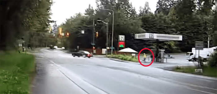 As we were approaching the 7-Eleven, Janet was ahead of Chuck. A car, travelling too fast, turned left from southbound 145th Ave NE east onto Juanita-Woodinville Way and spun out.