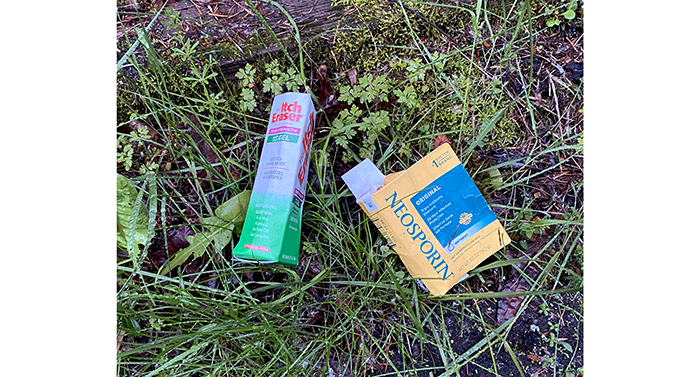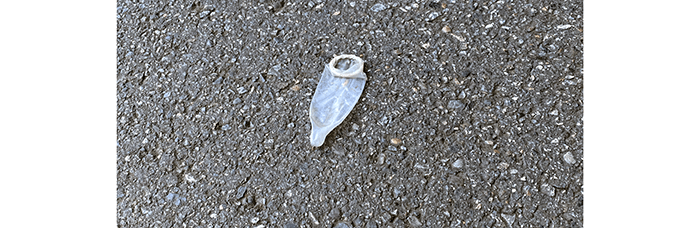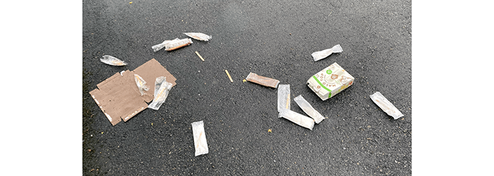 So there were several little bags of fruit juice with a popsicle stick floating inside. We picked them up and took them to a trash receptacle about forty feet away.