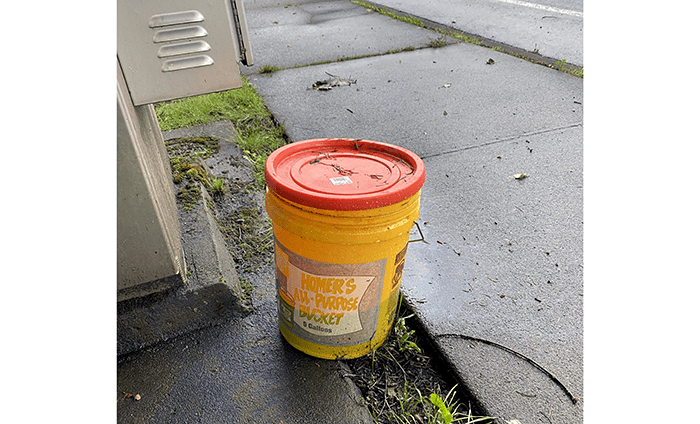 A five-gallon bucket about a third full of what looked to be motor oil. We left it but will report it to the City of Kirkland. However, unlike Bothell, Kirkland’s track record with us has not been stellar.
