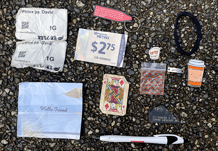 A ‘Hello Friend” note that was a thank-you from a teacher to a lady for helping monitor recesses. Probably so the teacher could go have a smoke. A nozzle cleaner, so if your nozzle needs cleaning, we have the tool. A metro ticket to who-knows-where.