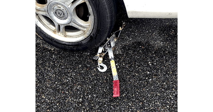 At the park-and-ride, we saw a winch behind the tire of a parked vehicle.