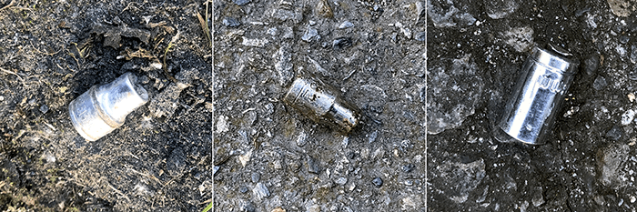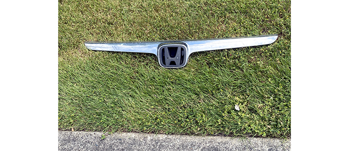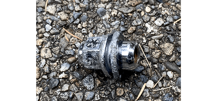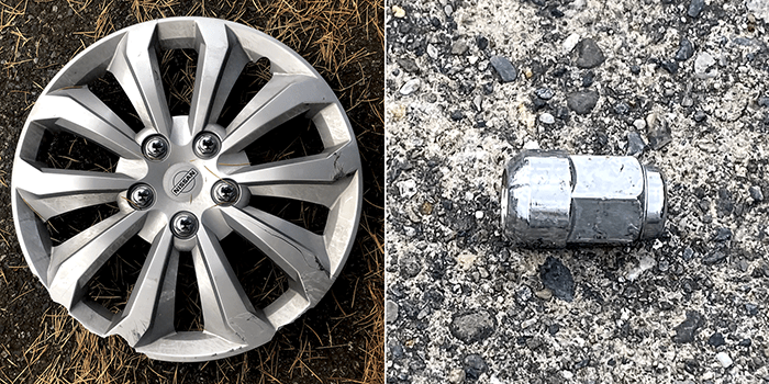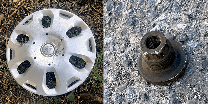 Don’t we always? A very beat-up wheel cover and a lost lug nut. The wheel cover was left at a bus stop and the lug nut is in our lug nut collection. Of course, we have a lug nut collection. Doesn’t everyone? What? A wheel cover collection? Do you think we are weird?