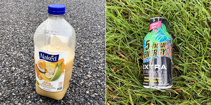 An opened quart of Pina Colada juice. We opened it but vapor flowed out like a beaker of acid in a horror movie. We poured it out. Then we found an unopened bottle of 5-hour Energy. After the bottle of acid, we were afraid to open five hours of pure energy.