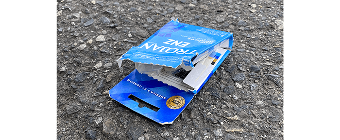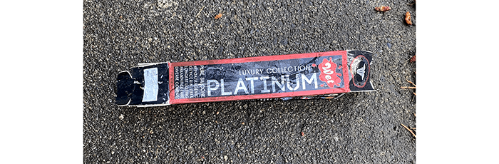 In the middle of the street next to Safeway, an empty carton for Luxury Collection Platinum personal lubricant.