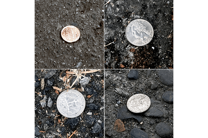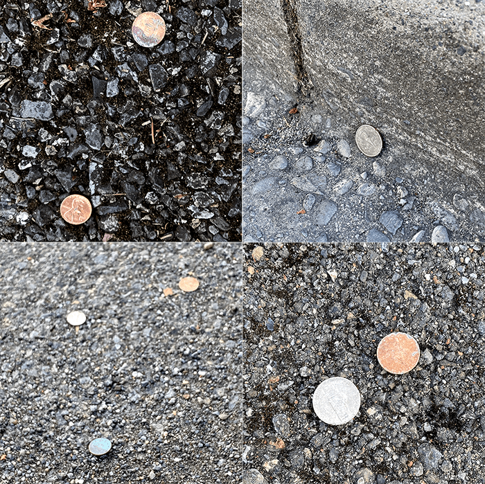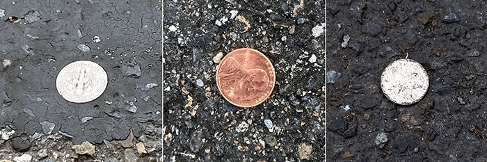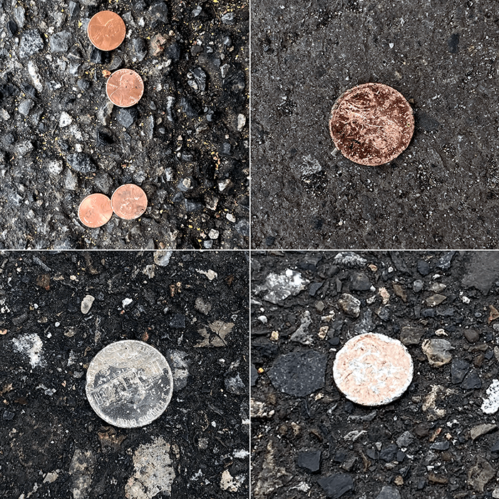The dime was embedded in road tar and needed to be pried out. The penny on the right looks like a dime but is really a penny.