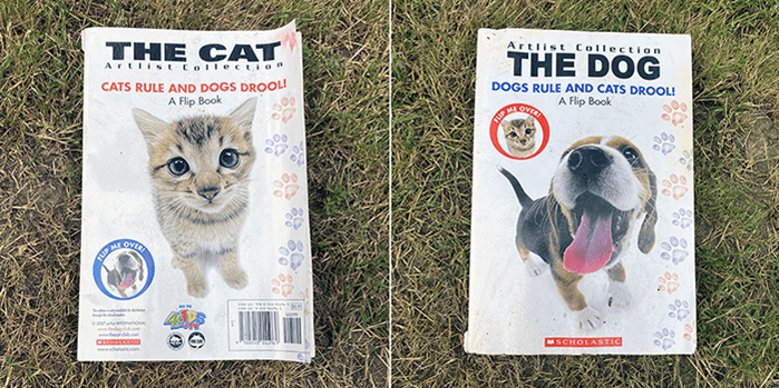 On one side, “Cats Rule and Dogs Drool!” On the flip side, “Dogs Rule and Cats Drool!” The author claims to be impartial, but have you ever seen a cat drool? It should be “Dogs Rule and Cats are Fools!” But perhaps we are just showing our own prejudices.