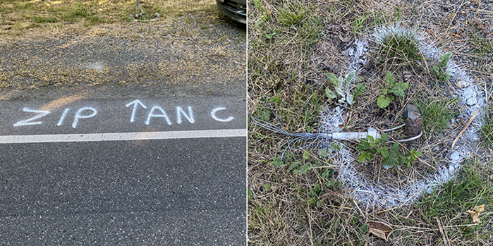 We had to check it out. It points to a broken telephone guy wire tiedown that has been there for years. We have no idea what this means. More to come.