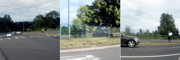 We walked to the end of the onramp and back up on the other side. As we passed the park-and-ride, we saw a man who seemed to be watching the woman. We figure they were working together, and she had the better chance of scoring some dollars. We couldn’t read what the sign said.