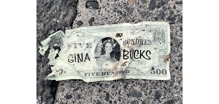 Five-hundred Gina Bucks. Hmm. This could be read a couple of ways. Think about it.