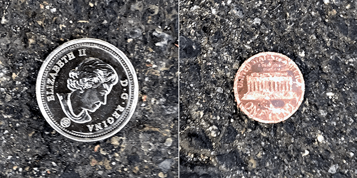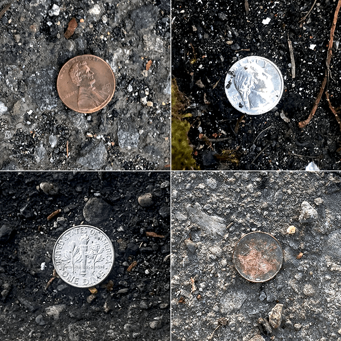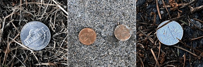 At the KinderCare, Janet found a nickel. She started to toss it back over the fence, but Chuck stopped her. What was she thinking – it could be a choking hazard!? Then, we found two pennies stuck in a crack at a gas station and a lone dime along Simonds Road. A nice seventeen-cent start to the week.
