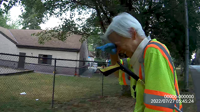 Another warm 67°F (19.5°C) morning that is starting to take a toll on us. If we were wearing shorts and no vest, it wouldn’t be so bad. However, that is not an option since we are often in the street and frequently wade into berry bushes. We removed a very small rabbit from the road but found a lot of change.