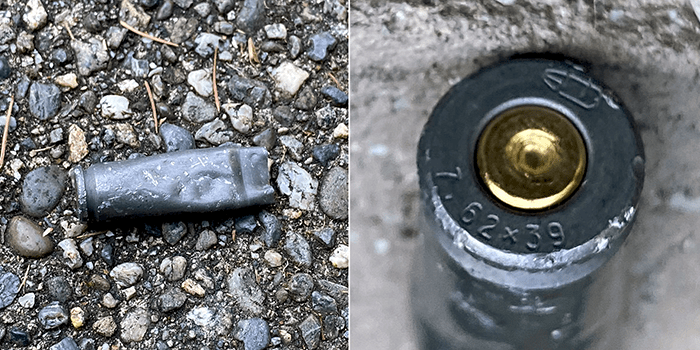 It had been runover. We checked the caliber, and it is a 7.62×39 round. Chuck is well aware of the 7.62 round for the M14 army rifle, but not the 7.62×39. According to Wikipedia, this round was “widely used due to the worldwide proliferation of Russian SKS and AK-47 pattern rifles.” Great, The Russians are coming! The Russians are coming!