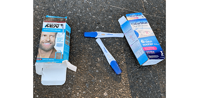 These were dropped together along 100th Ave NE. A beard facial hair coloring kit and a pregnancy test kit. Someone with a beard is worried that they are pregnant? Neither a bearded man nor a bearded woman needs to worry about becoming pregnant. We’ll leave it at that.