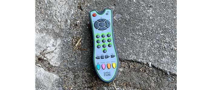 It is an Infini Fun My Remote Control. It is really a noise maker with no remote-control capabilities. The marketing states “The remote features 4 game modes and triggers silly sounds and lights.” Okay, that is a bit of an exaggeration. It had no remote-control features and only one light. The “game modes” refers to the four buttons on the bottom. They control what the number buttons do. In the blue mode, the buttons make random sounds. The other buttons say the button number in English, French, and Spanish. Therefore, “4 game modes.” However, it does make noise. “Timmy, Daddy’s driving, please stop punching those buttons. Timmy, stop making so much noise. Give me that damn thing.” Which is how we happened to find it in the gutter.