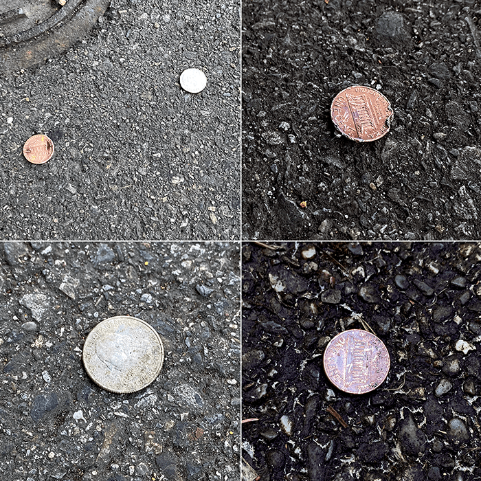 Thirty-eight cents, the hard way. First, near Safeway we found a dime and a penny in great condition. Then later a beat-up penny in the middle of the street. Then a corroded quarter in the gutter followed by another penny. Based on the locations, none were related except the first dime and penny. We don’t know who throws money around like this, but we appreciate it. Of course, foldable money would be more appreciated. Just saying.
