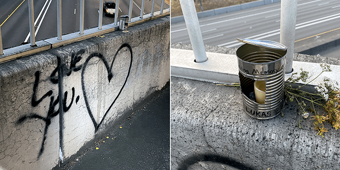 We saw the first one last year, shown on the right. With some research we found it was a memorial for a teenager who died from cancer. We don’t know why this is on the freeway overpass.