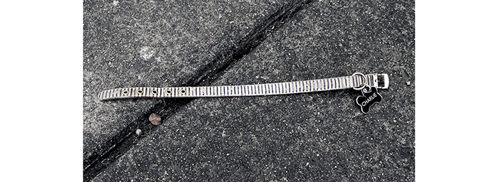 On the back was the telephone number of the dog’s owner. We left it on a fire hydrant and texted the owner where it was. They responded almost immediately with a thank you. Good deed for the day.