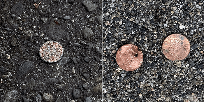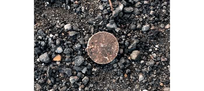 One penny on the freeway offramp, which is why it is so beat up. You could use it in a coin toss then spend fifteen minutes arguing whether it is heads or tails.