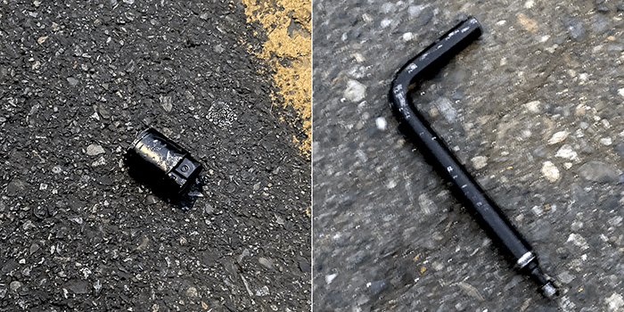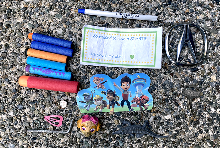 The Nerf turf wars appear to be continuing. And one of the gangs has escalated to magnum Nerf bullets. A small heart locket, a hair clip and a badly bent Allen wrench.