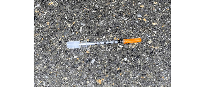 On the freeway off ramp, a used needle. “Whew, that school traffic was terrible. Its’s good I had a little something to give me a chill.”