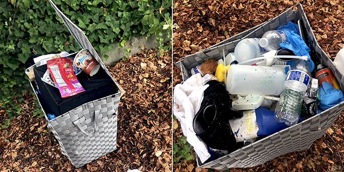 It was too big for us to carry, so went back later with the car. It was mostly cleaning supplies such as carpet cleaner, dish soap, window cleaner and so forth. Several of the bottles were empty. Most ended up being recycled or put in the garbage. The few bottles that were full will be turned in at a county hazardous materials collection event.