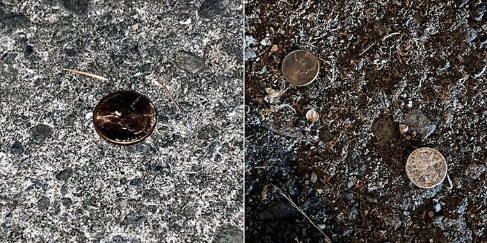 The first was very near our house and was probably a plant by a neighbor. We don’t mind, we’ll take any fool’s money, even if he is a cheapskate. Later, on the median at the freeway overpass, two more pennies.