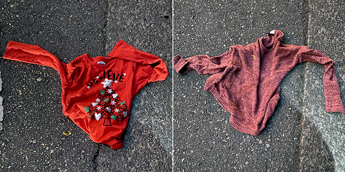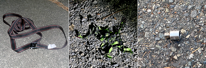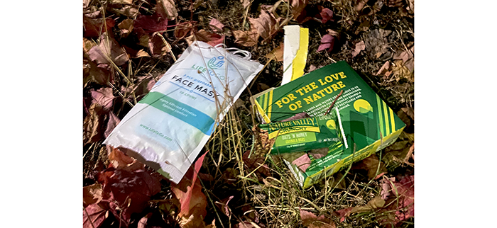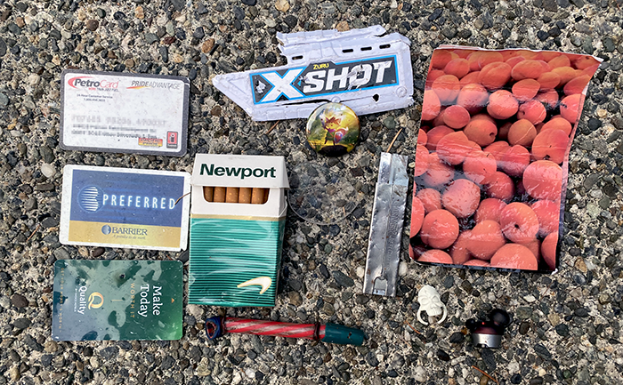 We figured that someone’s car got ransacked. “What, granola bars? That’s wussy food, get rid of it. And masks? We are so over that, toss them. Wait, what, a purse? What’s in it?”