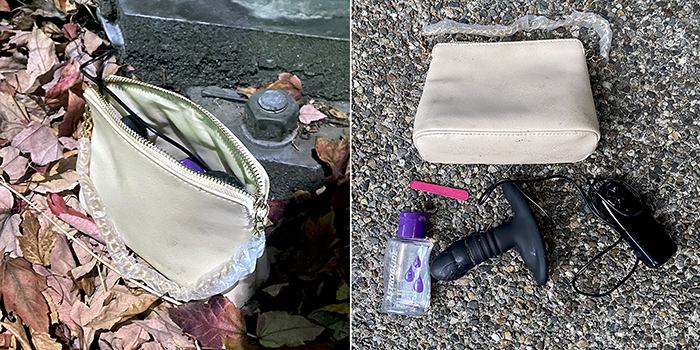 “What the heck? Toss it out! Toss it out! And what’s the pink nail file for?” And to make matters worse, the bottle contains “Astroglide.”