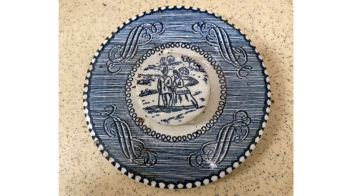 This appears to be the lid of a Currier and Ives Blue Sugar Bowl and Lid. Thirty-six dollars at this site, but this is only the lid, so it should be worth at least five bucks. Okay for ten bucks, and we’ll toss in four pounds of sugar. You supply the bowl. Let us know.