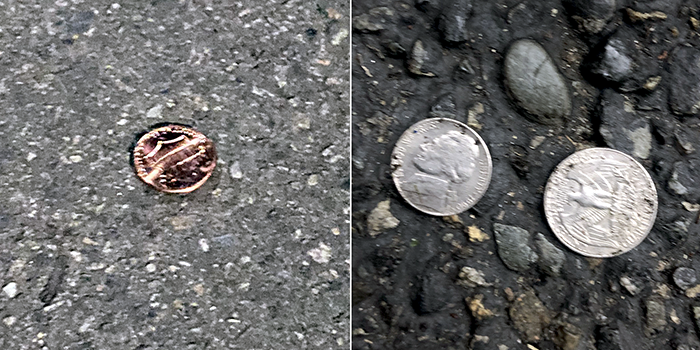 A single penny in the gutter near Safeway and thirty cents at a car vacuum cleaner at a service station. Janet frequently checks the vacuum place, and of course the Dairy Queen drive thru, and they sometimes pay off. And yes, Chuck found the single penny. But it was shiny.