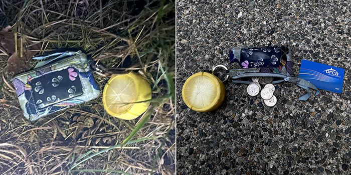 When we got home, we counted $9.52 in coins, and an Orca bus card. No identification, though. We found the coin purse on Amazon for $10.50 and the Lemon is a case for Apple AirPods, another $12.80. So, we are talking nearly thirty-three dollars. We are not counting the AirPod charger which is still there. We will try to track down the owner through the Orca card, but we are not holding out much hope. This is certainly much better than the other purse we found this week. We are not trying to track that owner down.