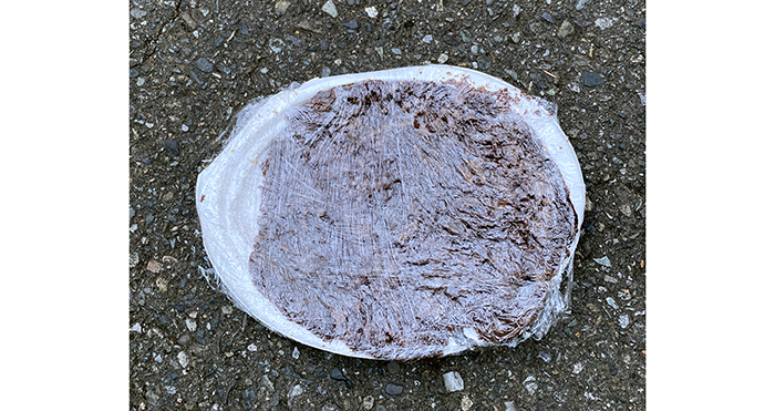 It had refried beans on it covered with plastic wrap. Refried beans are meant to be mashed, but not by leaving them in the street.