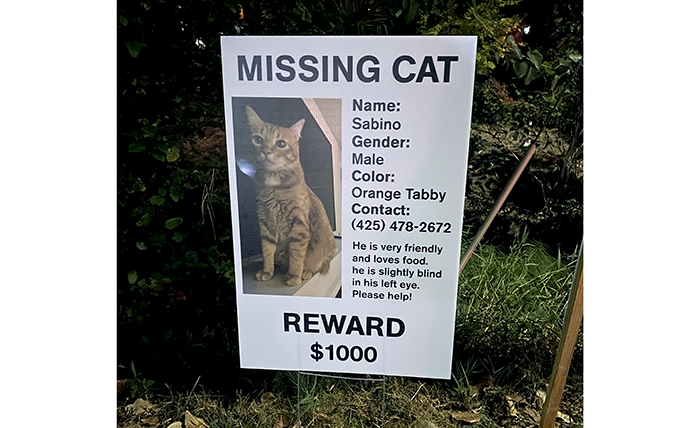 We see a lot of missing cat posters. We keep our eye out for them, but we do have a lot of coyotes around that help keep the rabbits in check. However, they probably mistake a cat for a rabbit now and then. In the last couple of days we’ve seen several printed lost-cat posters taped to just about everything. Today, they escalated their search with two-by-three-foot signs.