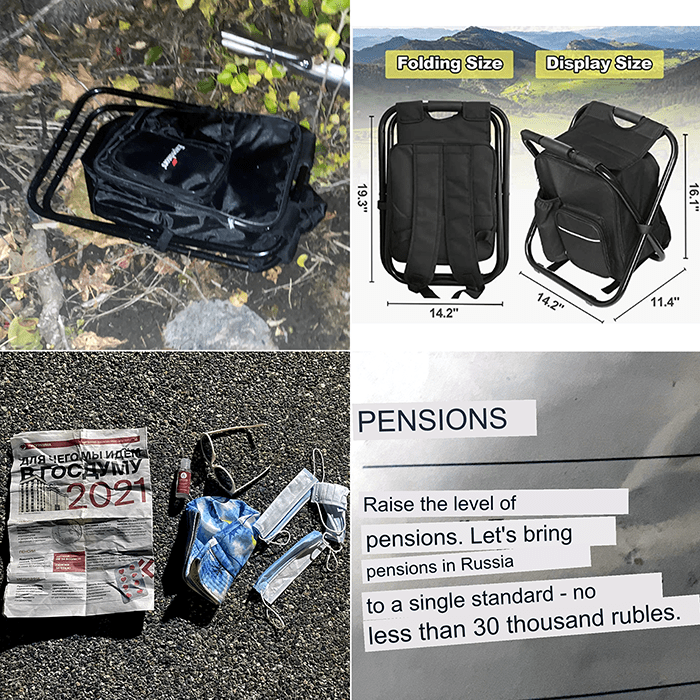 Inside was a small bottle of hand sanitizer, sunglasses, some masks, a hat, and a Russian political flyer. The headline reads “Why we go to the State Duma.” The State Duma is a Russian federal assembly, and this paper is a flyer from the “Pension Party”. It sounds like the AARP. The photo on the bottom right is a Google translation of one of the paragraphs. Thirty thousand rubles is about five hundred dollars. This flyer is from 2021. We assume they now have a better reason to go to the State Duma.