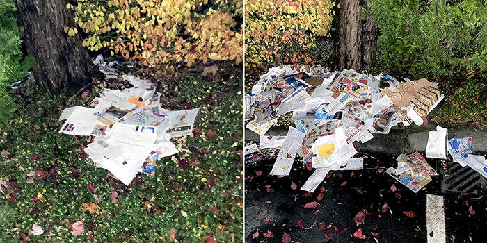 We found some mail under some bushes by some apartments.