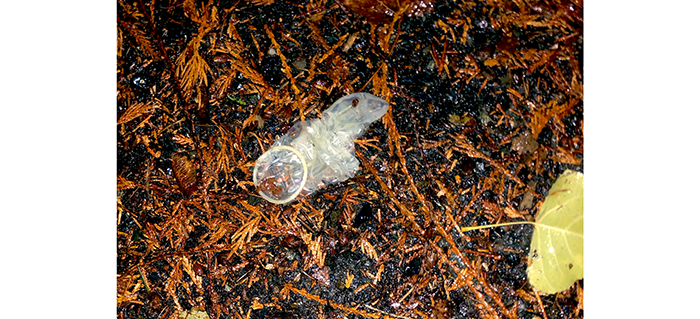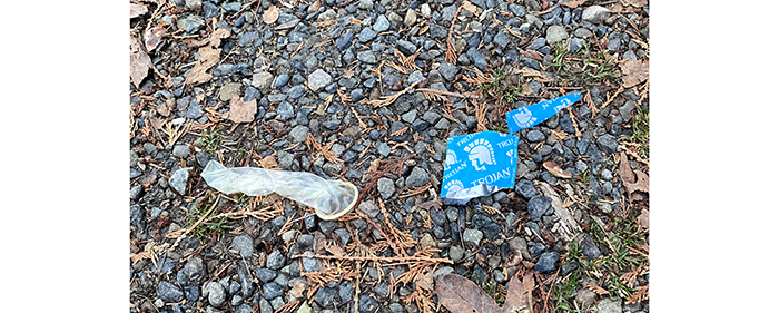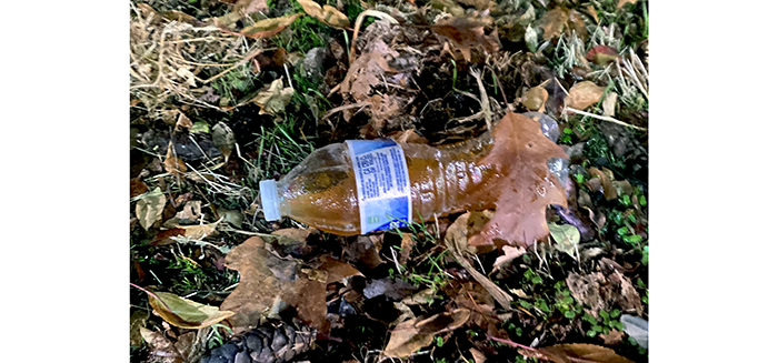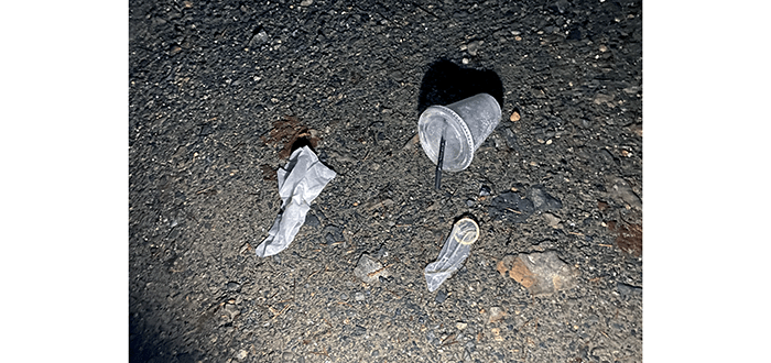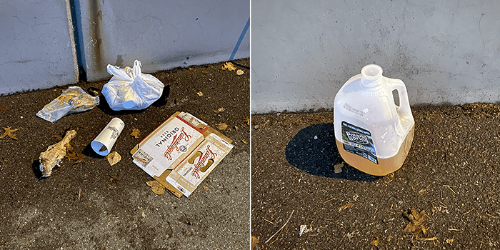 A large, partially eaten turkey drumstick, a bag of random trash and an empty 12-pack of Leinenkugel’s Original Beer. Next to the litter was the biggest urine water bottle we have found. But then again, it was an empty 12-pack.