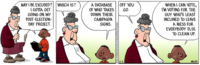 Every election that comes around, tons of political signs are planted at every intersection to fall over or be pulled out by the opposing party. When the election is over, most of the candidates collect their signs, but like campaign promises, the locations of the signs are often forgotten.