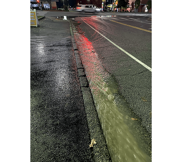 At the intersection of 100th Ave NE and NE 137th St. a deluge of water was running down the gutter and starting to flood the intersection.