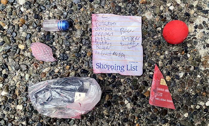On the upper right a dense foam ball. It’s not much fun. It doesn’t bounce very well. Below that, part of Melissa’s credit card. She might have cut this up on purpose. Wonder if she’d missed the chip if the card would be useable?