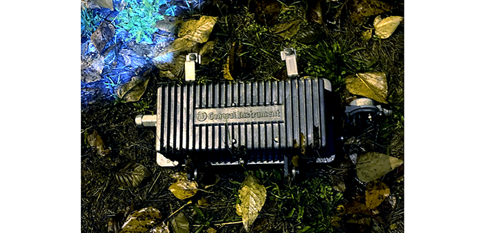 It appears to be a General Instruments cable amplifier. So, the story is a bit convoluted, but General Instruments was acquired by Motorola. At the time, Chuck worked for a company named Digeo that made set-top boxes for the cable industry. Then, a company named Arris bid against Motorola to acquire Digeo and won. Then Arris also acquired the Motorola division that acquired General Instruments. Somewhere at this time, Chuck retired. Then a company named CommScope acquired Arris. Bottom line, Chuck feels responsible for the piece of abandoned equipment and will attempt to get it removed.