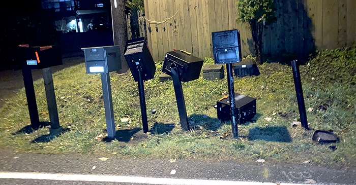 Finally, on Riverside Drive, a car took out three of seven mailboxes with only a mirror.