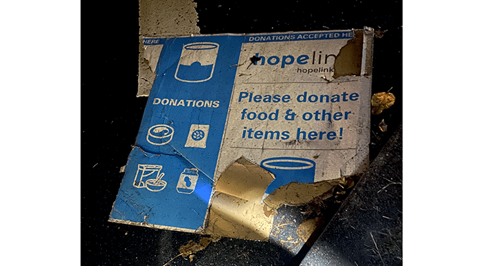 A Hopelink donation box. Not only did someone not donate, they stole the box of donations and littered the box. They reached a new low. Well, at least they didn’t defecate in the box like last week. We picked up the box and walked it back to the Chevron station.