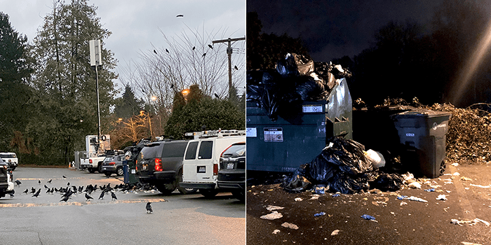 On Saturday, there was a wine-and-beer walk in downtown Bothell that we attended. The next day, as we were parking in the lot we clean up on Saturday, we saw some crows.